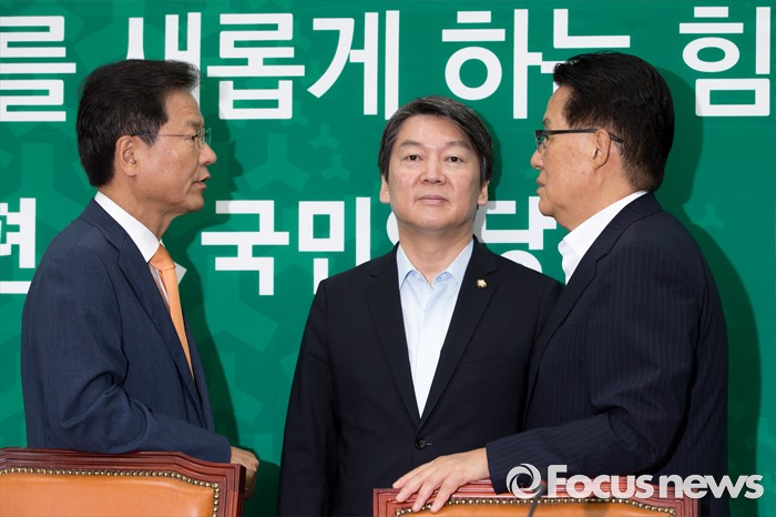 (서울=포커스뉴스) 천정배(왼쪽) 국민의당 공동대표와 박지원(오른쪽) 원내대표가 24일 오전 서울 여의도 국회에서 황인무 국방부 차관에게 북한 미사일 발사 관련 현안보고 받기 전 대화를 나누고 있다.