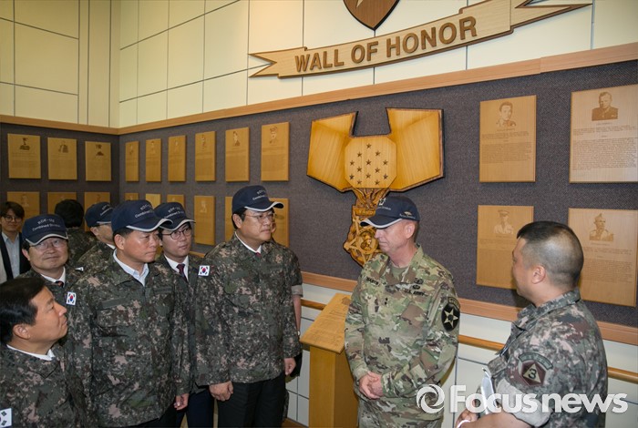 (의정부=포커스뉴스) 정진석 새누리당 원내대표와 김영우 국방위원장 등 의원들이 24일 오전 경기도 의정부 미2사단 한미연합사단을 방문해 테드 마틴 미2사단장으로부터 명예훈장 수여자 패널에 대한 설명을 듣고 있다.