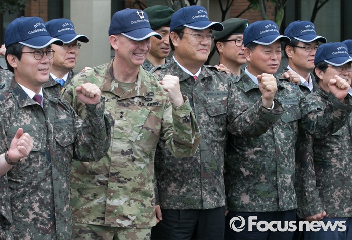 (의정부=포커스뉴스) 정진석 새누리당 원내대표와 김영우 국방위원장 등 의원들이 24일 오전 경기도 의정부 미2사단 한미연합사단을 방문해 테드 마틴 미2사단장 등 군 관계자들과 기념촬영을 하고 있다.