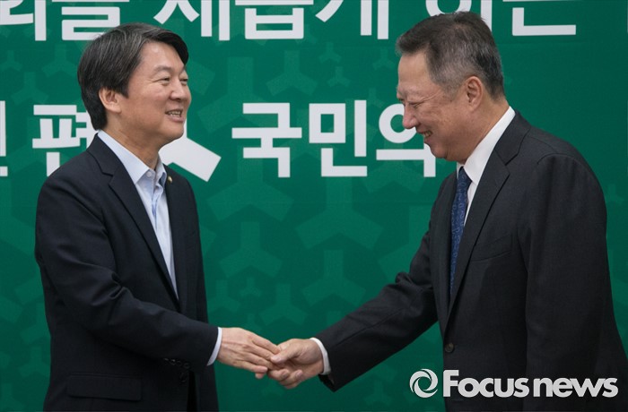 (서울=포커스뉴스) 안철수 국민의당 상임공동대표와 박용만 대한상공회의소 회장이 24일 오전 서울 여의도 국회에서 만나 인사하고 있다.
