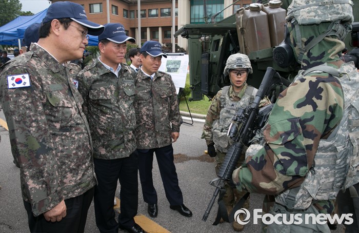 (의정부=포커스뉴스) 정진석 새누리당 원내대표 등 의원들이 24일 오전 경기도 의정부 미2사단 한미연합사단을 방문해 부대현황 보고를 받은 뒤 화학전 장비에 대한 설명을 듣고 있다.