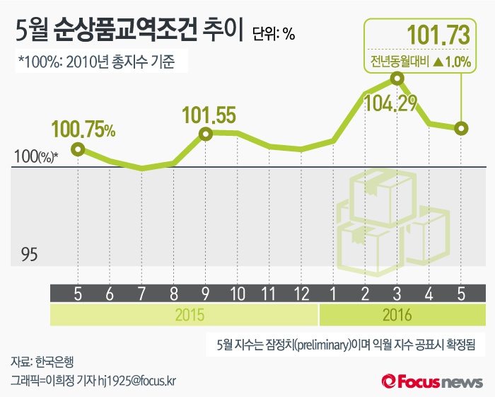 (서울=포커스뉴스) 24일 한국은행이 발표한 '5월 무역지수 및 교역조건'에 따르면 5월 순상품교역조건지수는 101.73로 전년 동월 대비 1.0% 상승했다.