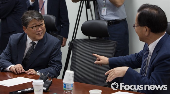 (서울=포커스뉴스) 24일 오후 서울 여의도 국회 의원회관에서 열린 여야 대구지역 의원들과 강호인 국토교통부 장관의 영남권 신공항 백지화 관련 면담에 참석한 조원진(왼쪽) 새누리당 의원과 김부겸 더불어민주당 의원이 대화하고 있다.