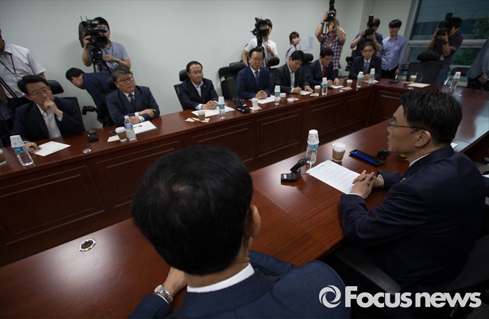 (서울=포커스뉴스) 24일 오후 서울 여의도 국회 의원회관에서 윤재옥 새누리당 대구시당 위원장, 김부겸 더불어민주당 의원, 홍의락 무소속 의원 등 여야 대구지역 의원들과 강호인 국토교통부 장관이 영남권 신공항 백지화 관련 면담을 하고 있다.