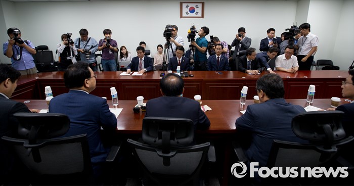 (서울=포커스뉴스) 24일 오후 서울 여의도 국회 의원회관에서 윤재옥 새누리당 대구시당 위원장, 김부겸 더불어민주당 의원, 홍의락 무소속 의원 등 여야 대구지역 의원들과 강호인 국토교통부 장관이 영남권 신공항 백지화 관련 면담을 하고 있다.