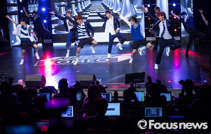 (서울=포커스뉴스) 24일 오후 서울 강남구 일지아트홀에서 아이돌 그룹 로미오의 미니앨범 'MIRO(미로)' 쇼케이스에 참여한 멤버들이 무대를 선보이고 있다.