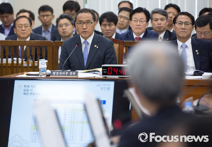 (서울=포커스뉴스) 24일 오전 서울 여의도 국회에서 열린 안전행정위원회 전체회의에 참석한 홍윤식(왼쪽) 행정자치부 장관이 의원들의 질의에 답하고 있다.