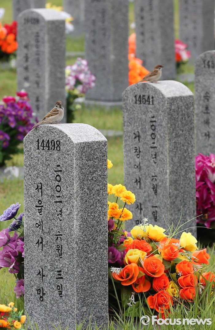 (대전=포커스뉴스) 6·25전쟁 66주년을 하루 앞둔 24일 오후 대전 유성구 국립대전현충원 사병 묘비에 참새가 앉아 있다.