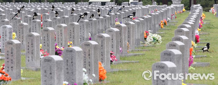 (대전=포커스뉴스) 6·25전쟁 66주년을 하루 앞둔 24일 오후 대전 유성구 국립대전현충원 사병 묘비에 수 십 마리의 까치가 앉아 있다.