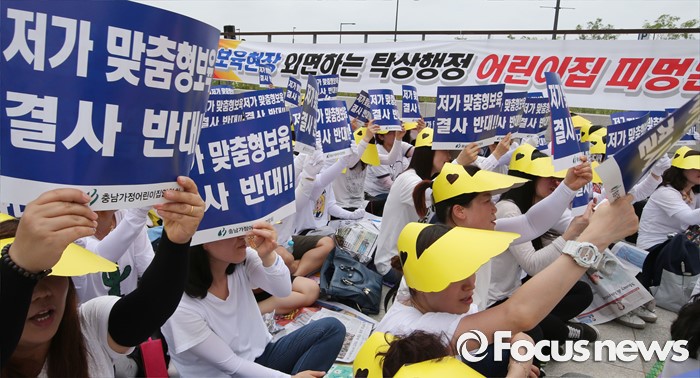 24일 보건복지부 집계에 따르면 오전 10시 현재 휴원 중인 어린이집은 없으며, 자율등원 형태로 운영 중인 어린이집은 총 3670개인 것으로 조사됐다. 이는 전체 어린이집 4만1441개 중 8.9%에 해당한다.(세종=포커스뉴스) 23일 오전 세종시 정부세종청사 보건복지부 앞에서 충남민간어린이집연합회 회원들이 맞춤형보육 제도개선 및 시행연기 촉구 결의대회를 열고 있다. 2016.06.23 김기태 기자