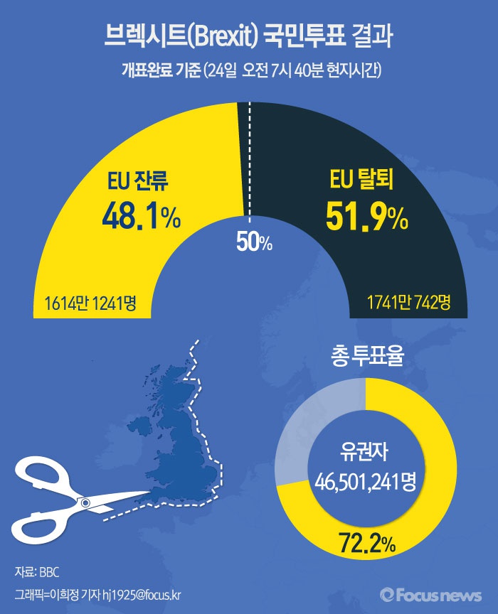 (서울=포커스뉴스) 영국 전역에서 총 4650만6678명이 참여한 브렉시트 국민투표가 24일 오전 8시(현지시간)개표 완료됐다. 국민투표 개표 결과 영국은 '브렉시트'(영국의 유럽연합 탈퇴)를 선택했다.