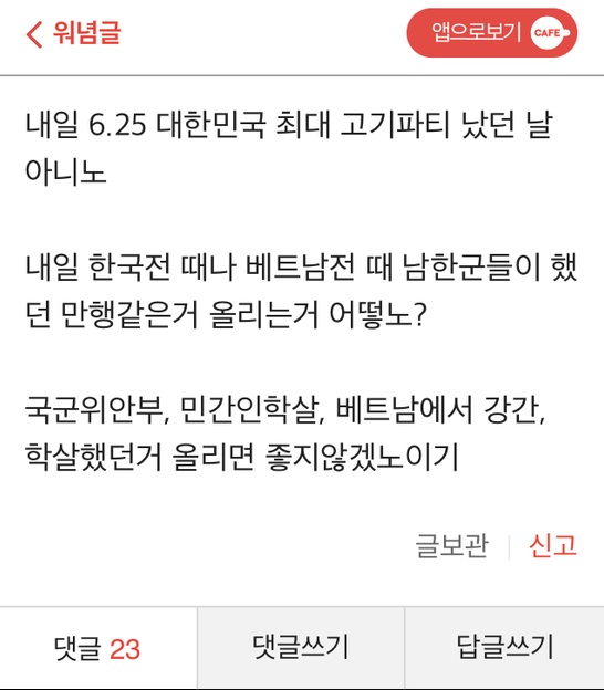 이 게시글에는 전쟁 당시 참전용사들이 저질렀던 전쟁범죄들을 파헤쳐 알리자며 '국군위안부', '민간인학살' 등을 거론하기도 했다.
