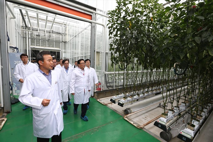 (진주=포커스뉴스) 이동필 농림축산식품부 장관이 24일 경남 진주시 경남도농업기술원 첨단농업에서 열린스마트 팜 확산 상반기 점검회의에 참석전 경남도농업기술원 'ATEC 첨단온실' 스마트 팜 재배 시설을 둘러보고 있다. <사진제공=농림축산식품부>