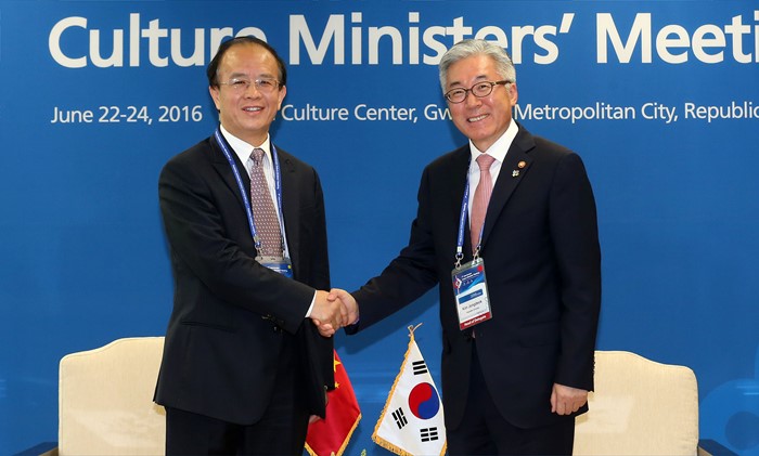 (광주=포커스뉴스) 김종덕(오른쪽) 문화체육관광부 장관이 23일 제7차 ASEM 문화장관회의가 열리고 있는 광주시 동구 국립아시아문화전당에서 딩웨이(丁偉, Ding Wei) 중국 문화부 차관과 접견을 하고 있다. <사진제공=문화체육관광부>