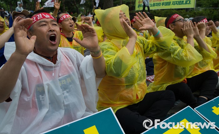 (서울=포커스뉴스) 24일 오후 서울 영등포구 산업은행 앞에서 열린 '성과급제 폐지와 노동기본권 쟁취를 위한 공무원·교사 결의대회'에 참가한 전국교직원노동조합과 전국공무원노동조합 조합원들이 시작을 알리는 함성을 지르고 있다.