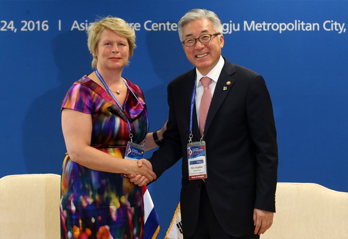 (광주=포커스뉴스)김종덕(오른쪽) 문화체육관광부 장관이 23일 제7차 ASEM 문화장관회의가 열리고 있는 광주시 동구 국립아시아문화전당에서 마랸 하머스마(Marjan Hammersma) 네덜란드 문화부 차관과 접견을 하고 있다. <사진제공=문화체육관광부>