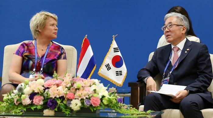 (광주=포커스뉴스)김종덕(오른쪽) 문화체육관광부 장관이 23일 제7차 ASEM 문화장관회의가 열리고 있는 광주시 동구 국립아시아문화전당에서 마랸 하머스마(Marjan Hammersma) 네덜란드 문화부 차관과 접견을 하고 있다. <사진제공=문화체육관광부>