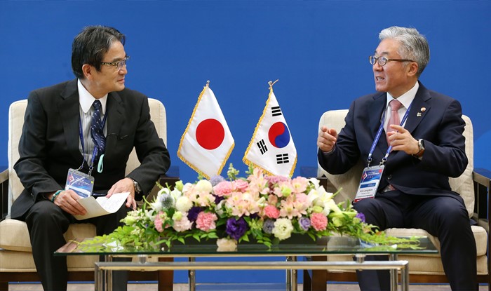 (광주=포커스뉴스) 김종덕(오른쪽) 문화체육관광부 장관이 23일 제7차 ASEM 문화장관회의가 열리고 있는 광주시 동구 국립아시아문화전당에서 미야타 료헤이(Ryohei Miyata, 宮田 亮平) 일본 문화청장과 접견을 하고 있다. <사진제공=문화체육관광부>