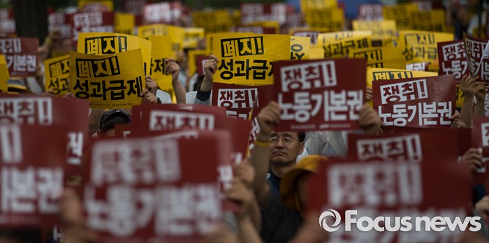 이들은 24일 오후 4시부터 서울 여의도 산업은행 앞에서 결의대회를 열고 해직자 복직과 정부의 성과급제 폐지를 촉구했다.