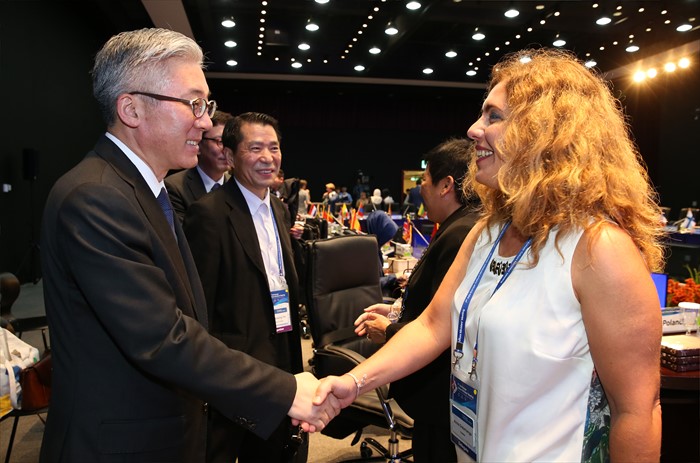 (광주=포커스뉴스) 김종덕 문화체육관광부 장관이 24일 광주시 동구 국립아시아문화전당 국제회의장에서 열린 제7차 ASEM 문화장관회의 본회의를 마치고 참석자들과 인사를 하고 있다. <사진제공=문화체육관광부>