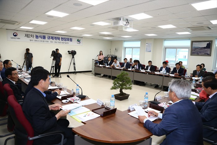 (고성=포커스뉴스) 이동필 농림축산식품부 장관이 24일 경남 고성군 농업기술센터에서 재정부 법제처장 등이 참석한 가운데 열린 규제개혁 현장포럼에 참석해 규제개혁 간담회를 진행하고 있다. <사진제공=농림축산식품부>
