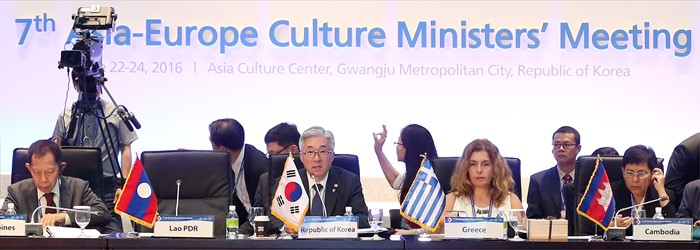 (광주=포커스뉴스) 김종덕 문화체육관광부 장관이 24일 광주시 동구 국립아시아문화전당 국제회의장에서 열린 제7차 ASEM 문화장관회의 본회의에서 의장성명서를 발표하고 있다. <사진제공=문화체육관광부>