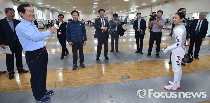 (서울=포커스뉴스) 정세균 국회의장이 24일 오후 서울 노원구 태릉선수촌을 방문해 브라질 리우 올림픽을 앞두고 훈련 중인 남현희 선수와 펜싱 대결을 하고 있다.