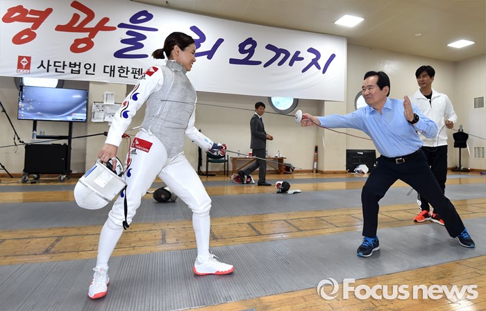 (서울=포커스뉴스) 정세균(오른쪽) 국회의장이 24일 오후 서울 노원구 태릉선수촌을 방문해 브라질 리우 올림픽을 앞두고 훈련 중인 남현희 선수와 펜싱 대결을 하고 있다.
