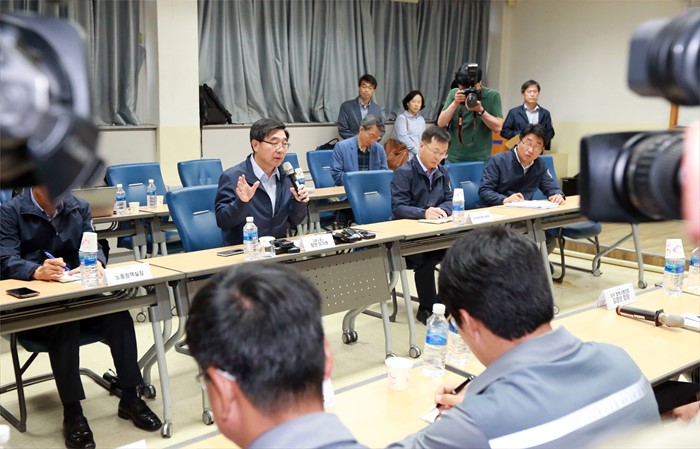 (거제=포커스뉴스) 이기권 고용노동부 장관이 24일 경남 거제를 방문하여 대우조선해양 및 삼성중공업 협력업체와 간담회를 갖고 업황 부진으로 어려움을 겪는 조선업 종사자 의견을 청취하고 있다. <사진제공=고용노동부>