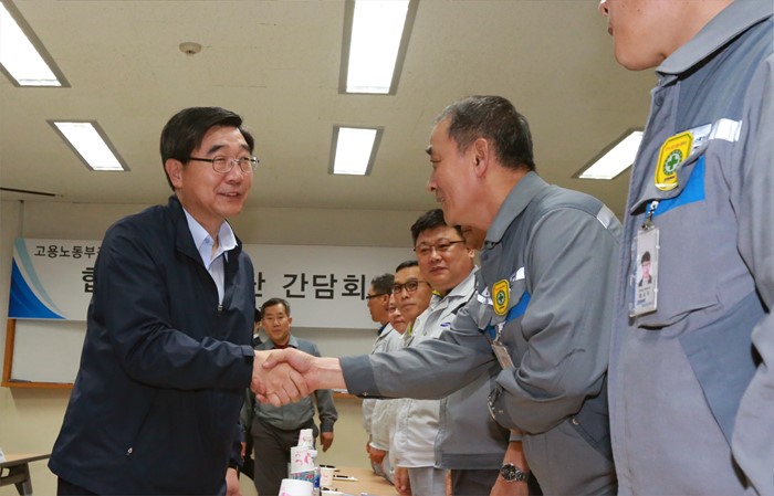 (거제=포커스뉴스) 이기권 고용노동부 장관이 24일 경남 거제를 방문하여 대우조선해양 및 삼성중공업 협력업체와 간담회를 갖고 업황 부진으로 어려움을 겪는 조선업 종사자 의견을 청취했다. 이 장관이 참석자와 악수하고 있다. <사진제공=고용노동부>