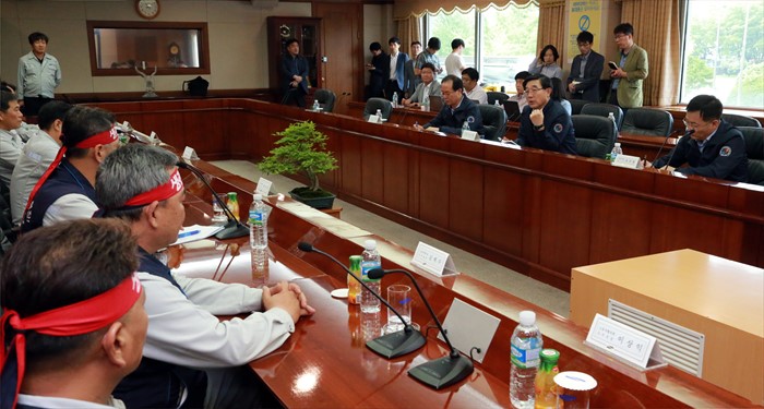 (거제=포커스뉴스) 이기권 고용노동부 장관이 24일 경남 거제 삼성중공업 노사와 간담회를 갖고 업황 부진으로 어려움을 겪는 조선업 종사자 의견을 청취하고 있다. <사진제공=고용노동부>