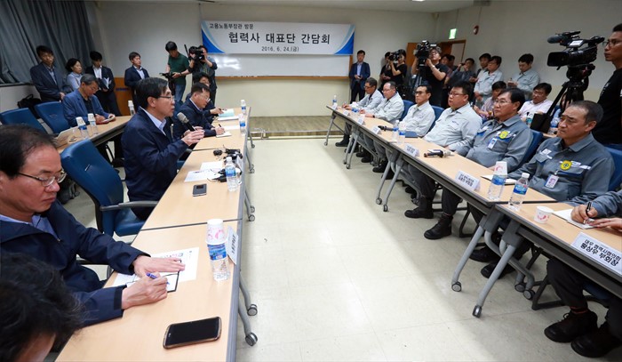 (거제=포커스뉴스) 이기권 고용노동부 장관이 24일 경남 거제를 방문하여 대우조선해양 및 삼성중공업 협력업체와 간담회를 갖고 업황 부진으로 어려움을 겪는 조선업 종사자 의견을 청취하고 있다. <사진제공=고용노동부>