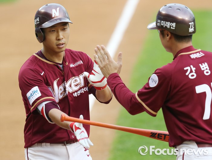 (서울=포커스뉴스) 24일 서울 잠실구장에서 열린 2016 프로야구 넥센-LG 경기 1회초 1사후 넥센 고종욱이 우월 솔로 홈런을 치고 강병식 코치의 환영을 받으며 홈인하고 있다.