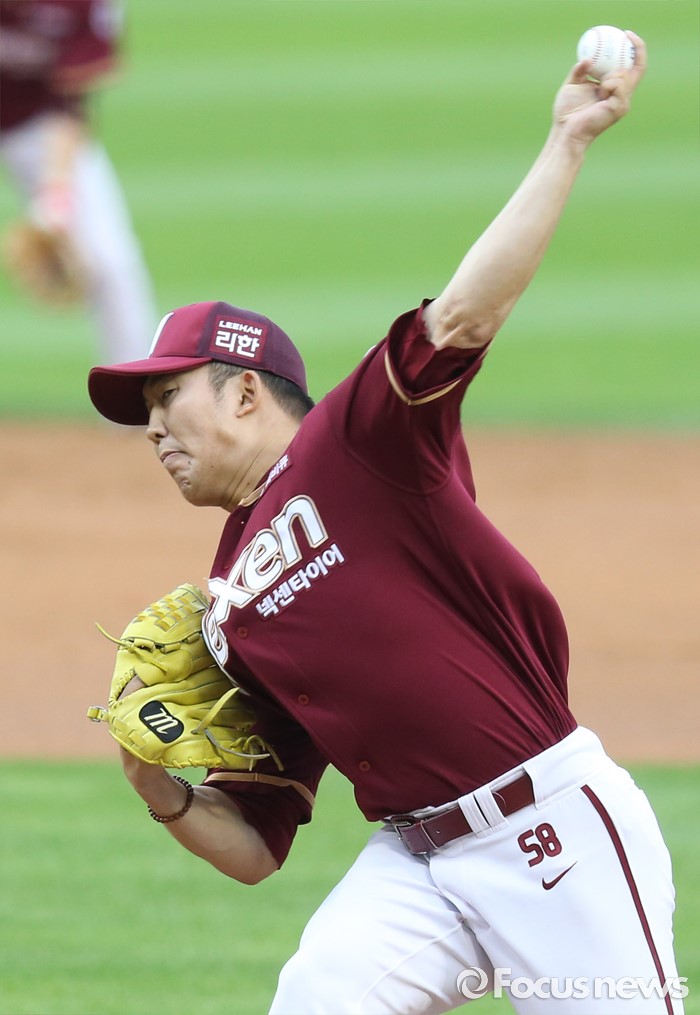 (서울=포커스뉴스) 24일 서울 잠실구장에서 열린 2016 프로야구 넥센-LG 경기에서 1회말 넥센 선발투수 금민철이 투구하고 있다.