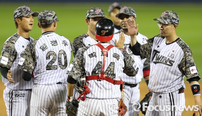 (서울=포커스뉴스) 24일 서울 잠실구장에서 열린 2016 프로야구 넥센-LG 경기에서 8회 히메네스의 홈런으로 역전승한 LG 선수들이 마운드에 모여 하이파이브하며 승리의 기쁨을 나누고 있다.
