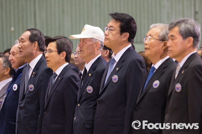 (서울=포커스뉴스) 25일 오전 서울 송파구 잠실실내체육관에서 열린 '6.25전쟁 66주년 기념식'에 참석한 박승춘(왼쪽 두 번째) 국가보훈처장, 황교안(왼쪽 세 번째) 국무총리, 정진석(오른쪽 세 번째) 새누리당 원내대표, 김종인(오른쪽 두 번째) 더불어민주당 비상대책위 대표가 국민의례를 하고 있다.