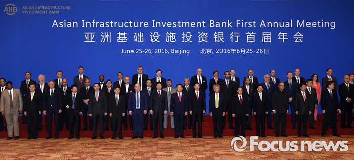 (서울=포커스뉴스) 유일호 부총리 겸 기획재정부 장관이 25일 중국 북경 월드호텔에서 열린 '제1차 아시아인프라개발은행(AIIB) 연차총회' 참석,각국 대표들과 기념촬영에 앞서 환담을 나누고 있다. <사진제공=기획재정부>