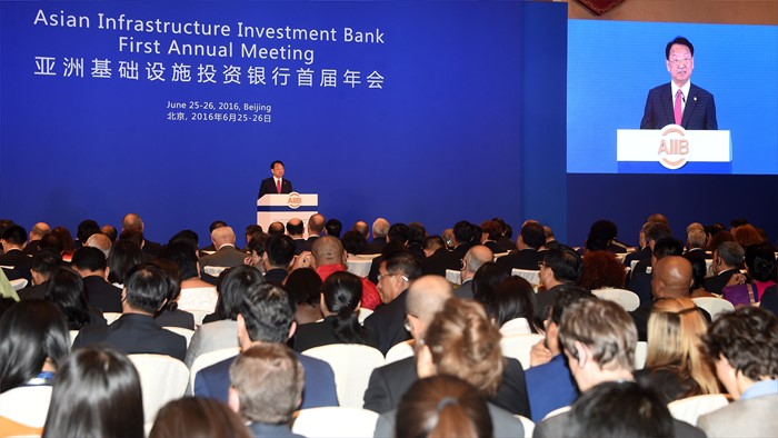(서울=포커스뉴스) 유일호 부총리 겸 기획재정부 장관이 25일 중국 북경 월드호텔에서 열린 '제1차 아시아인프라개발은행(AIIB) 연차총회' 참석해 기조연설을 하고 있다. <사진제공=기획재정부>