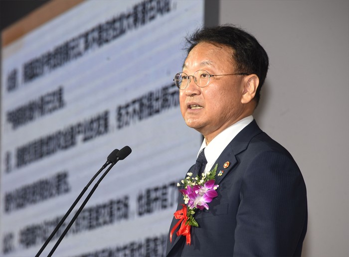 (서울=포커스뉴스) 제1차 아시아인프라개발은행(AIIB) 연차총회 참석차 중국 북경을 방문중인 유일호 부총리 겸 기획재정부 장관이 24일 웨스틴호텔에서 열린 '원-위안화 직거래 관련 청산은행 개소식'에 참석해축사를 하고 있다. <사진제공=기획재정부>