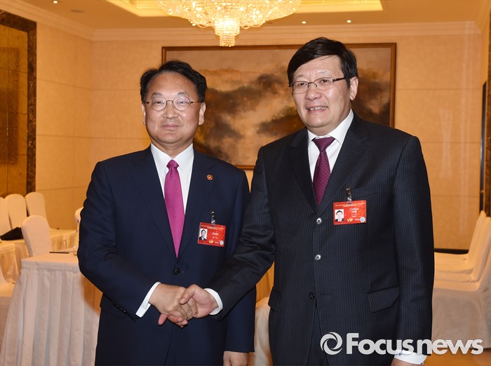 (서울=포커스뉴스) 제1차 아시아인프라개발은행(AIIB) 연차총회 참석차 중국 북경을 방문중인 유일호 부총리 겸 기획재정부 장관이 25일 월드호텔에서 러우 지웨이 중국 재무장관과 면담에 앞서 악수하며 인사를 나누고 있다. <사진제공=기획재정부>