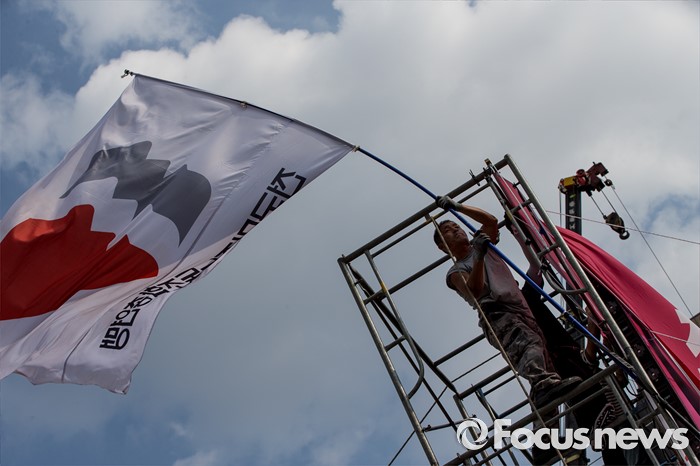 (서울=포커스뉴스) 25일 오후 서울 중구 시청광장에서 열린 '민주노총 전국노동자대회'에서 한 관계자가 민주노총 깃발을 들고 있다.