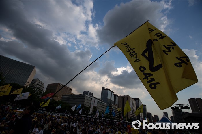 (서울=포커스뉴스) 25일 오후 서울 종로구 광화문광장에서 세월호 가족협의회 및 시민들이 참석한 가운데 '세월호 특별법 개정 촉구 범국민대회'가 열리고 있다.
