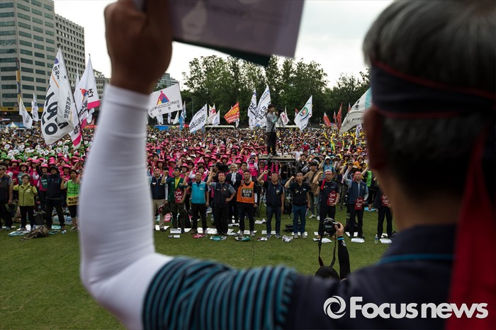 (서울=포커스뉴스) 25일 오후 서울 중구 시청광장에서 열린 '민주노총 전국노동자대회' 참석자들이 최저임금 1만원, 비정규직 철폐를 촉구하며 구호를 외치고 있다.
