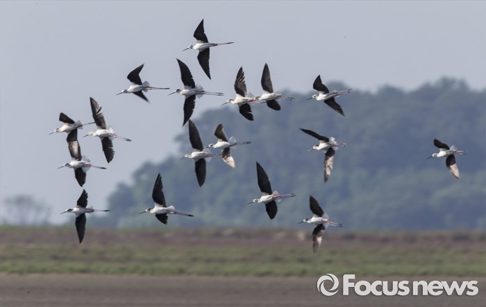 (인천=포커스뉴스)장다리물떼새들이26일 오전 수량이갑자기 줄어든 영종도 매립지 습지에서쉴곳을 찾아 방황하고 있다.