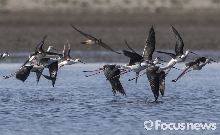 (인천=포커스뉴스)장다리물떼새들이26일 오전 영종도 매립지 습지에서 맹금류인새호리기(위쪽)에게 쫒기고 있다. 습지의 물이 1/3로 줄어들자 이런 위협은 빈도수가 높아지고 있다.