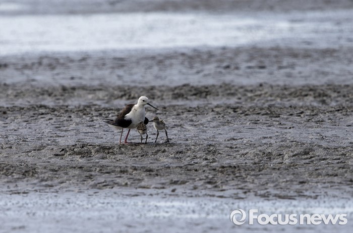 (인천=포커스뉴스)부화한지 1 주일 정도로 영종도 매립지 습지에서 가장 늦게 세상에 나온장다리물떼새 어린새가 말라 가는습지에서 어미가 만들어준 그늘 아래 휴식을 취하고 있다.