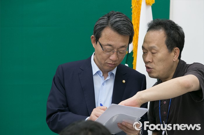 | △ 기자간담회 앞서 논의하는 김성식 |