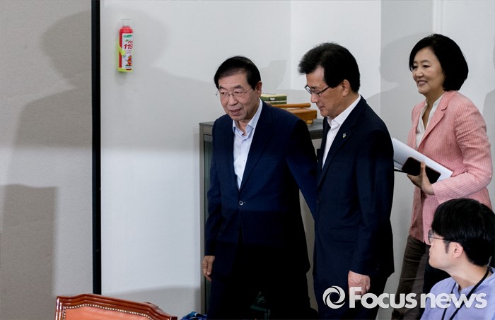 (서울=포커스뉴스) 26일 오전 서울 여의도 국회에서 열린 더불어민주당 시도지사 정책협의회에 참좋은지방정부위원회 공동위원장인 박원순(왼쪽) 서울시장, 박영선(오른쪽) 의원과 이시종 충북도지사가 참석하고 있다.