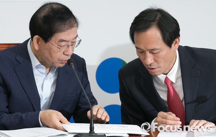 (서울=포커스뉴스) 26일 오전 서울 여의도 국회에서 열린 더불어민주당 시도지사 정책협의회에 참석한 참좋은지방정부위원회 공동위원장인 박원순(왼쪽) 서울시장과 우상호 원내대표가 대화하고 있다.
