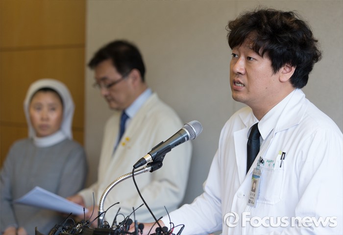 (서울=포커스뉴스) 26일 오후 서울 서초구 서울성모병원에서 서울성모병원 응급의학과 주치의 임지용 교수가 탤런트 김성민 자살시도 관련 브리핑을 하고 있다.